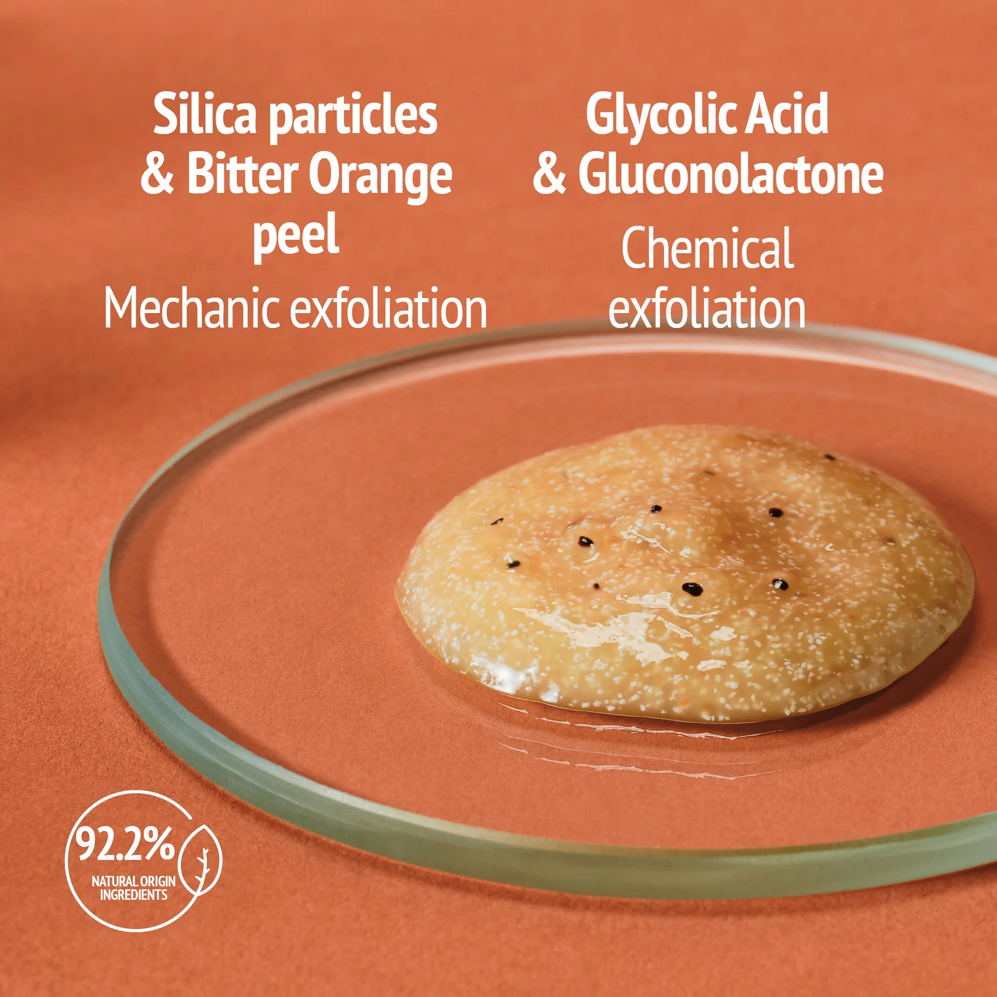 – Action mécanique grâce aux écorces d’orange amère et aux microsphères de silice